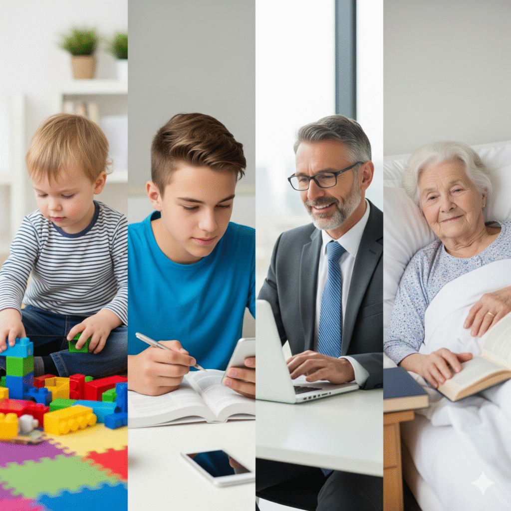 শৈশব, কৈশোর, প্রৌঢ়, বার্ধক্য-