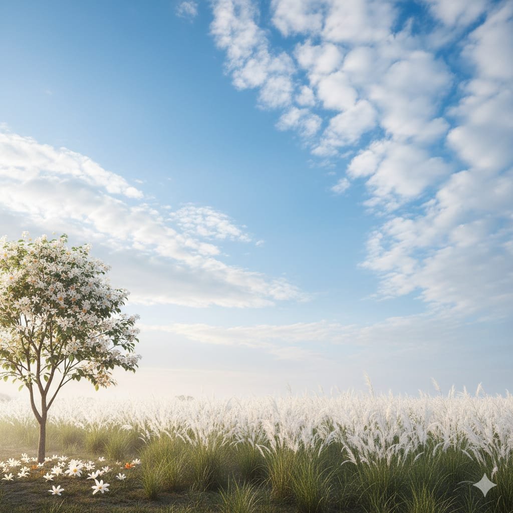 দিকে দিকে কাশফুল আর জুঁই, মালতী, কামিনী, টগরের মিলিত সমারোহে যেন,