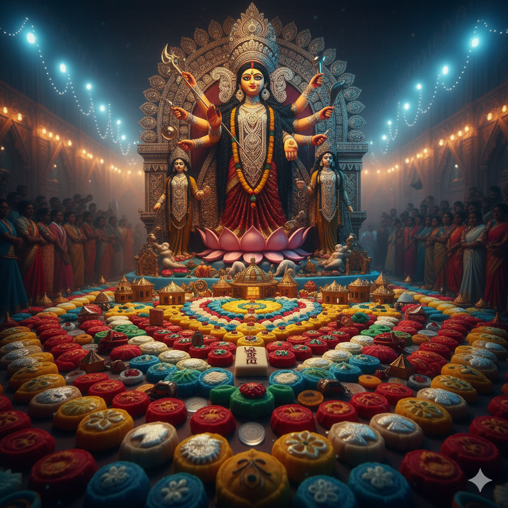 মাটির প্রতিমার সামনে হাজার রঙের সন্দেশ ছড়িয়ে আছে।