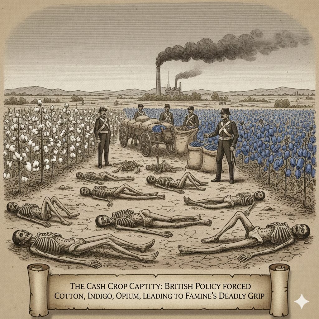 তুলো, নীল, আফিম, এমন সব নগদ ফসল চাষে বাধ্য করা হয়,