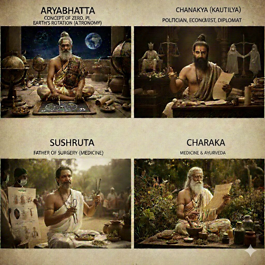 - আর্যভট্ট– শূন্যের ধারণা, পাই, পৃথিবীর ঘূর্ণন (জ্যোতির্বিজ্ঞান)।