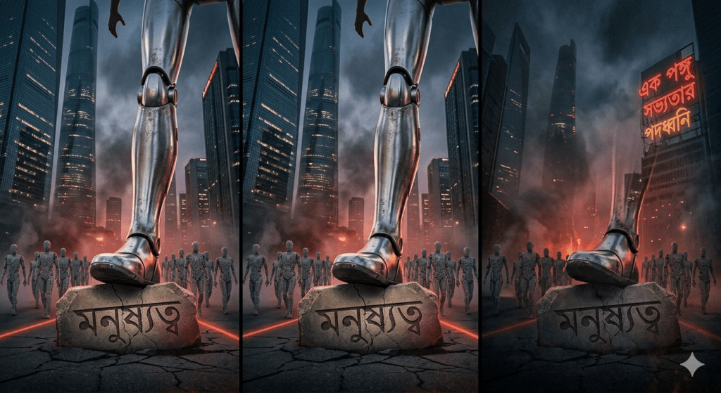 আজকের আকাশ ছোঁয়া অট্টালিকা আর চকচকে ক্যারিয়ারের নিচে নিঃশব্দে পিষে দম বন্ধ হয়ে যাচ্ছে একটা জ্যান্ত শব্দ—“মনুষ্যত্ব।”