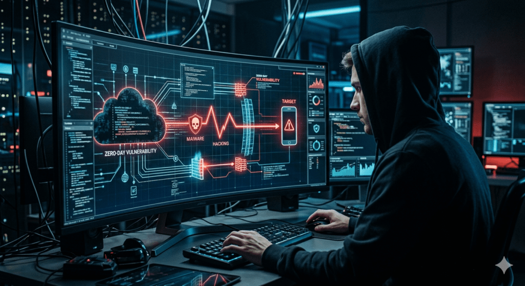 হ্যাকাররা সিস্টেমের নিরাপত্তা ত্রুটি (Zero-Day Vulnerability) খুঁজে বের করে।
