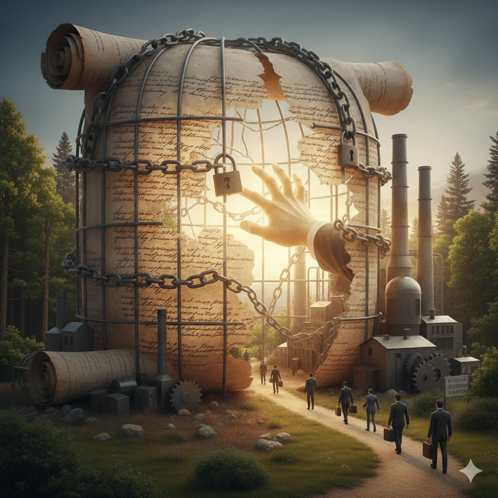 অর্থাৎ বড় শিল্পের আইন কাগজের কারাগারে বন্দী আছে,