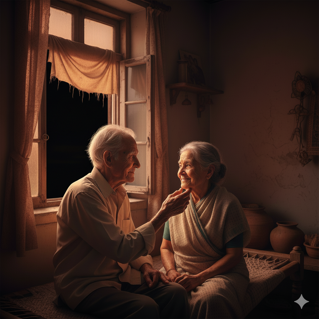 বৃদ্ধ স্বামীর হাতটা স্ত্রীর চিবুকে।