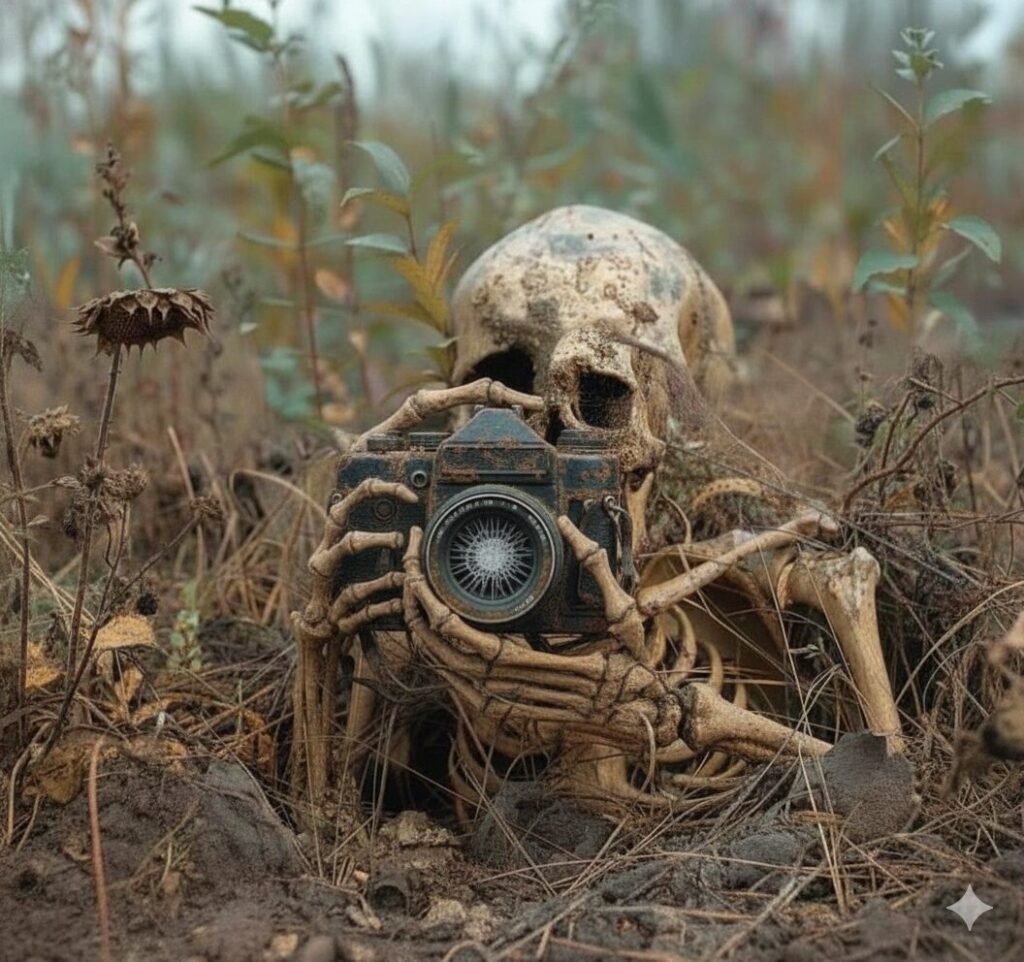 ধুলো-মাটি ও কিছু মরিচা পড়া এক ক্যামেরা, আর এর ঠিক পেছনেই একটা হাড়ের শরীর, এমনভাবে শুয়ে পড়ে আছে,