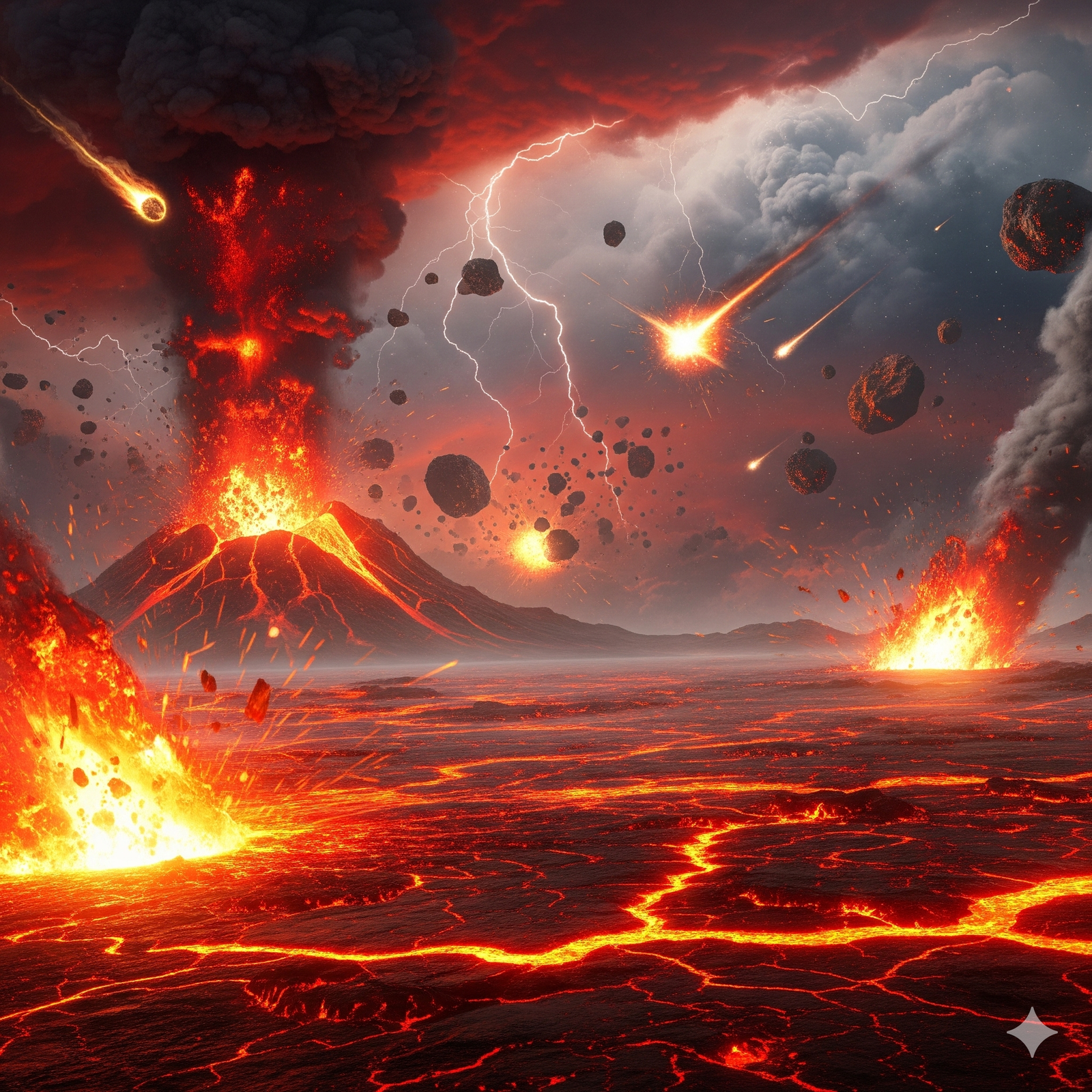 প্রায় ৪.৬ বিলিয়ন বছর আগে পৃথিবীর জন্মলগ্নের এক ভয়াবহ চিত্র। সে সময়ে গ্রহটা ছিল উত্তপ্ত লাভা, বিষাক্ত গ্যাস এবং উল্কাপাতে ভরা এক বিশৃঙ্খল অগ্নিগোলক।